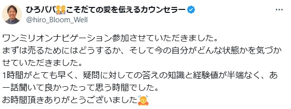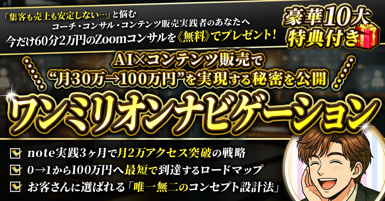 更に現在募集停止中の「ワンミリオンナビゲーション」もプレゼントします。個別にZoomを使ってあなたの悩みに対して1,000万円以上の自己投資と15年の経験から導き出した実践的なアドバイスをさせて頂きます。